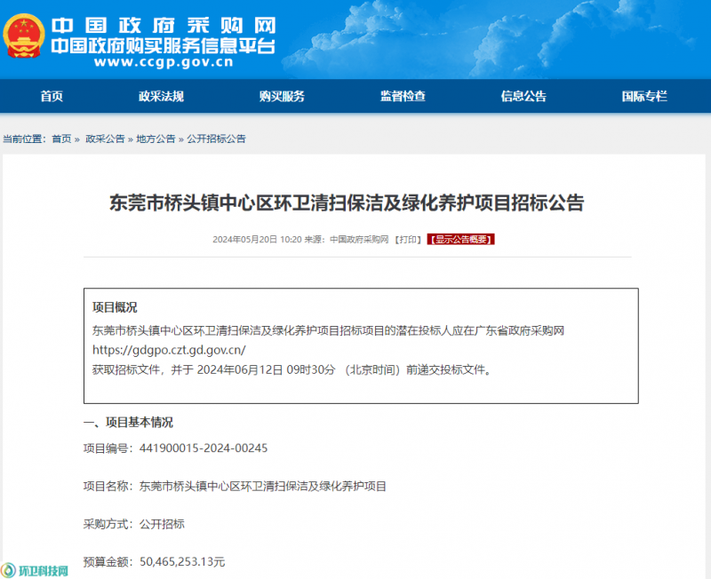 环卫科技网讯,5月20日,中国政府采购网发布东莞市桥头镇中心区环卫清扫保洁及绿化养护项目招标公告,预算金额5046.53万元,服务期两年。
