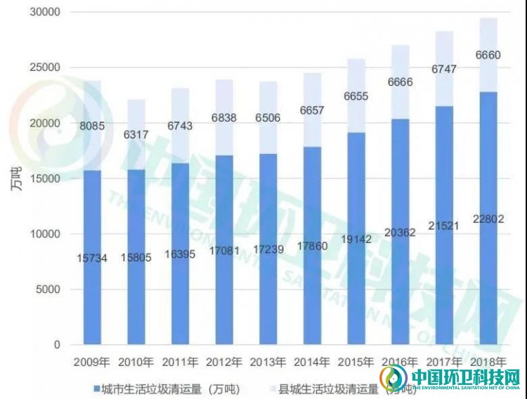 根据住建部数据统计,近10年来垃圾清运量保持稳定增长,年平均增长率约为3%。直到2018年底,我国城镇生活垃圾清运量共计29462万吨,其中城市生活垃圾清运量为22802万吨,县城生活垃圾清运量为6660万吨。