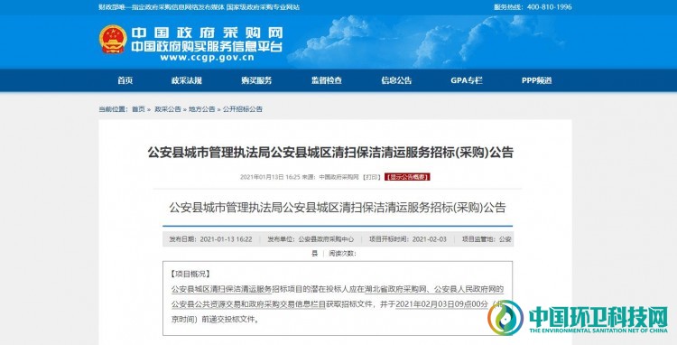 环卫科技网讯,1月13日中国政府采购网发布湖北省荆州市公安县城区清扫保洁清运服务招标(采购)公告。项目总预算金额4485.73万元...
