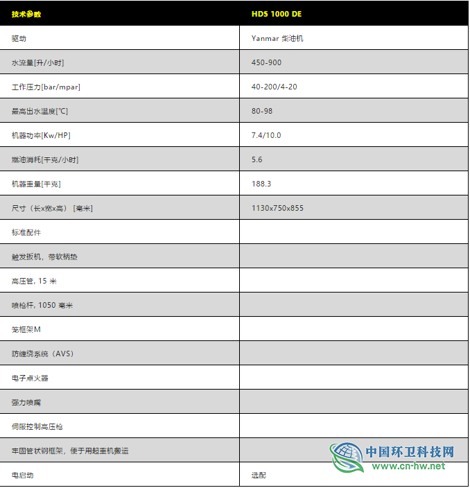HDS1000DE为德国原装进口的柴油引擎式冷、热水高压清洗机,配有防垢装置、低油位控制系统及Kärcher生产的高品质高压泵和加热锅炉单元。其枪把伺服控制可调节压力和水流,保证热水恒温、持久输出。而巨大的压力则可快速高效地清理路面重度油污和顽固污渍以及大型环卫设备和垃圾场;同时,高温持久地输出还可实现杀菌和除草功能,且环保无污,是市政环卫的理想工具