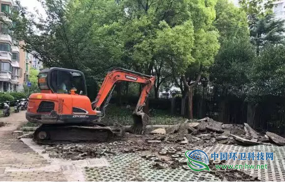 图为万景园小区物业将停车位拆去,恢复绿化原样。(图片源于东方网)