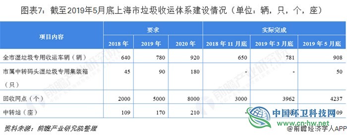 分类收运体系基本形成,回收体系初具雏形。《上海市生活垃圾全程分类体系建设行动计划(2018-2020年)》中,对2019-20年湿垃圾专用收运车辆,湿垃圾专用集装箱,回收网点、中转站等设备设施的数量都有着明确的要求,而截至2019年5月底,上海市湿垃圾专用收运车辆已达908辆(超额完成19年780辆的要求),湿垃圾专用集装箱/回收网点/中转站数量分别达50只/4237个/109座,基本满足整体计划的进度,为垃圾分类后的收运过程提供了有效保障。