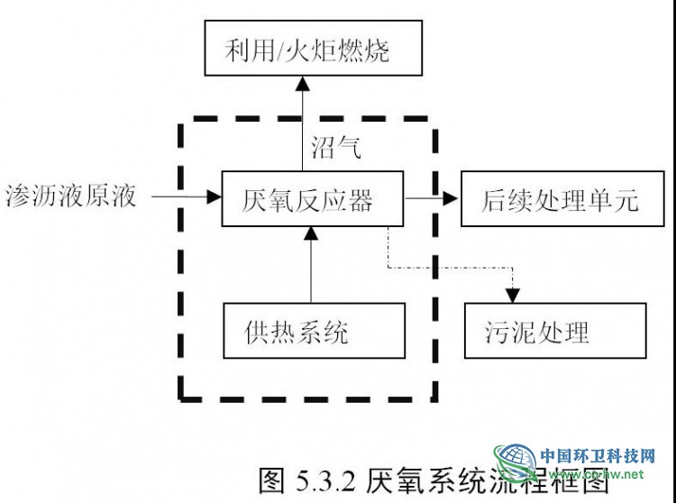 2)厌氧生物处理系统包括厌氧反应器、供热系统(常温厌氧的除外)、沼气利用系统、污泥处理系统等,宜参照工艺流程图5.3.2设计。