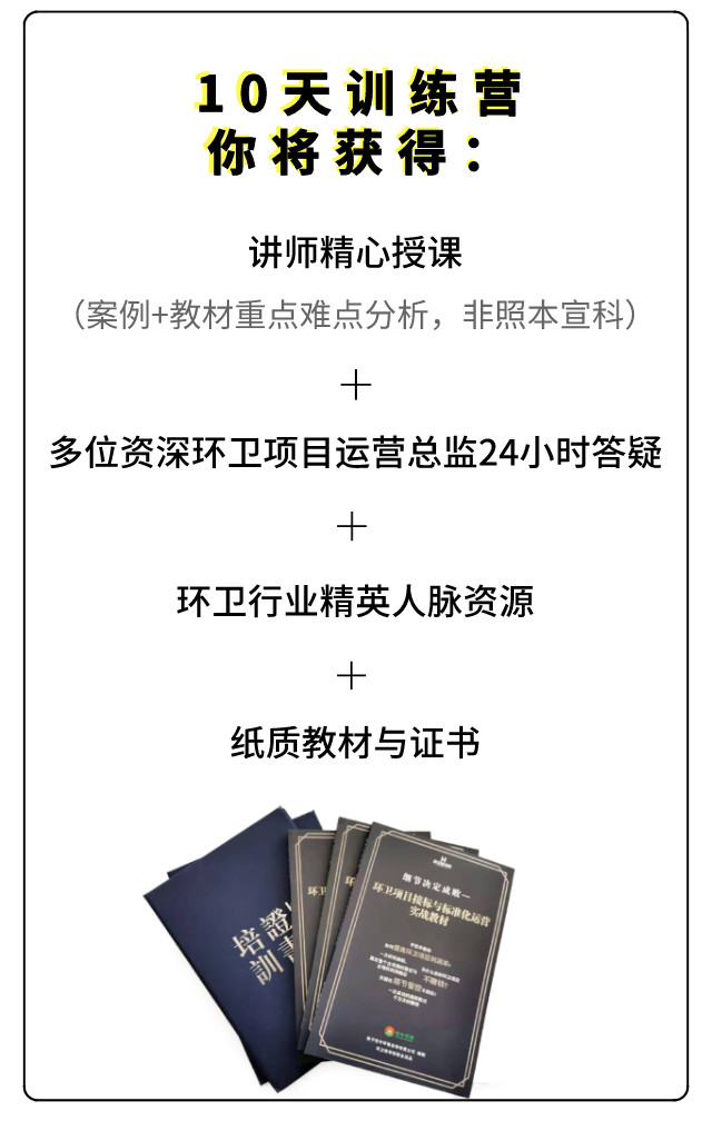 老师们也为这次线上培训专门备课,加入了大量案例、图片和更多环卫现场实战细节……多位环卫项目资深项目经理看过教材后说:对于初入行的环卫项目经理,看了这个教材,一边学习一边进场都没问题;如果再参加完这个训练营,环卫项目的管理层工作任你挑!