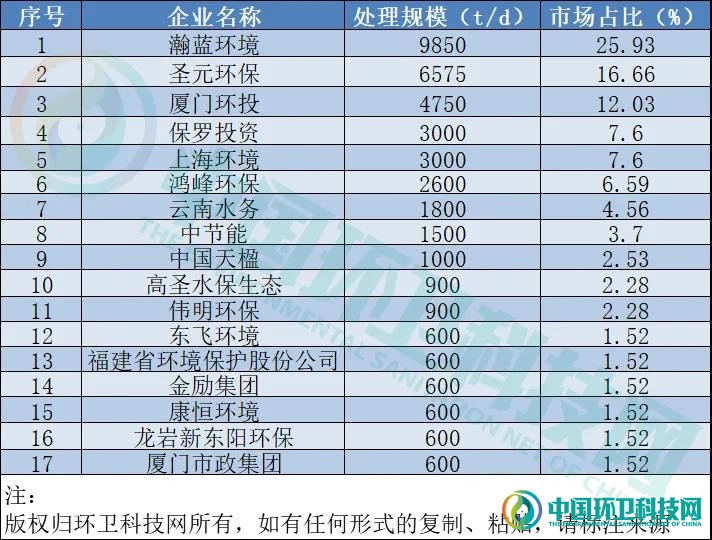 此外,厦门环投在福建省拥有5个项目,日总处理规模4750吨;上海环境旗下企业拥有3个项目,总处理规模3000吨。二者在省内市场占有率分别为12.03%和7.6%。排名前三位的企业占据了福建省54.62%的处理规模,集中度较高。