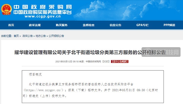 环卫科技网讯,5月12日,中国政府采购网发布杭州市萧山区北干街道垃圾分类第三方服务的招标公告,项目总预算2338.70万元,开标时间为2021年05月31日 09:30,不接受联合体投标。